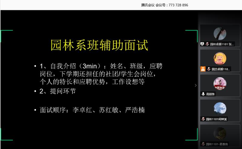 为选好园林系2020级班辅助,6月14日,william威廉中文官网园林系通过腾讯会议平台举行了2020级的班辅助面试会议。全系共50余名2018级、2019级的报名者了参加本次面试。面试由辅导员助理张璇同学主持人,园林系辅导员高丽珠老师、欧成川老师以及四位2019级园林系辅导员助理担任评委。