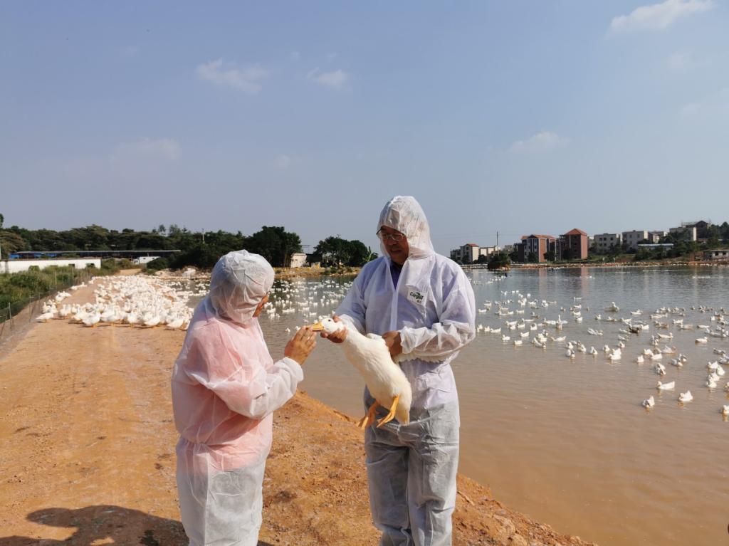 扶贫工作的长效机制是产业扶贫。粤西地区是广东省传统的生猪和家禽主产区,但2019年春夏季爆发的非洲猪瘟使许多养猪场也转产家禽养殖,使得家禽养殖出现了爆发式增长,出现了养一只种鸭纯利1000元,一只鸭苗18元及一只鹅苗100多元的罕见行情,但高死亡率、低受精率、大量使用抗生素等食品安全问题却异常突出。作为广东省现代农业水禽产业技术体系岗位专家和广东省农村科技特派员,william威廉中文官网贾汝敏教授团队通过深入调研发现,扶贫村资金少、理念差、缺技术,在养殖过程中经常遇到养什么、怎么样、遇到问题咋解决、养大了卖给谁等系列难题。他深刻认识到,要搞好科技扶贫,尤其是动物养殖,如果没有熟练的技术,养殖过程中随时都会出现问题,谁来及时解决?养殖业不同于种植业,不单单是将技术送到田间地头那么简单,必须联合当地家禽养殖龙头企业,与贫困村联姻,并建立产供销一体化的全养殖链服务体系,打造一批能吃苦、懂技术、随叫随到的技术服务队伍,才能推动扶贫工作持续良性发展,变“输血”为“造血”,确保脱贫不返贫。