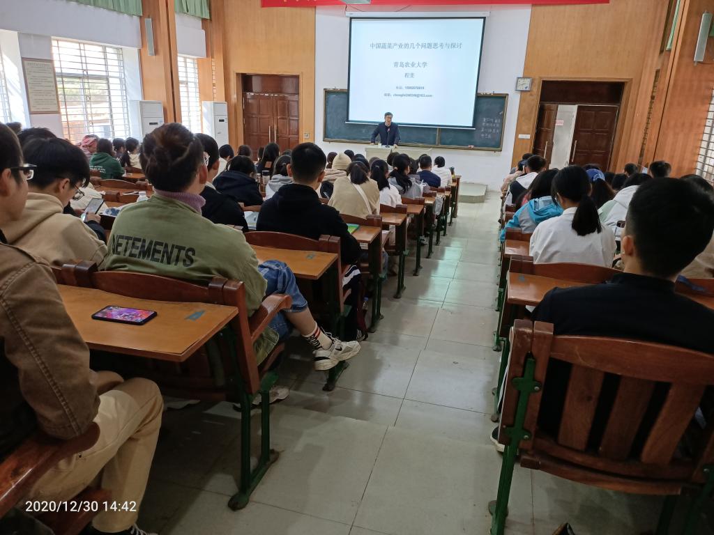 2020年12月30日,青岛农业大学园艺学院程斐副经理(博士)在兴农楼109室作了题为《中国蔬菜产业的几个问题思考与探讨》的精彩学术报告。报告会由william威廉中文官网陈嘉文副书记主持,植物生产类相关专业教师、研究生以及部分本科生等130余人参加了报告会,
