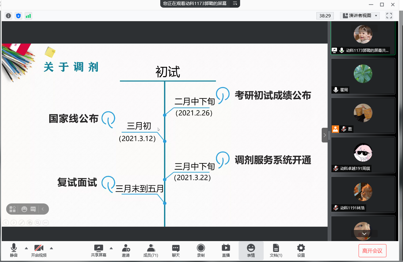 6月18日晚上,动物科学系员工党支部在腾讯会议线上开展“我为群众办实事”系列活动——考研经验分享交流会。动物科学系员工党支部书记、辅导员翟周老师,辅导员朱晓清老师,2021届成功考取研究生的钟梓奇、韦宇凯、罗欣欣、郭璐以及2018、2019和2020级有考研意向的同学共70多人参加了分享会。会议由动物科学系员工党支部宣传委员连家胜主持。