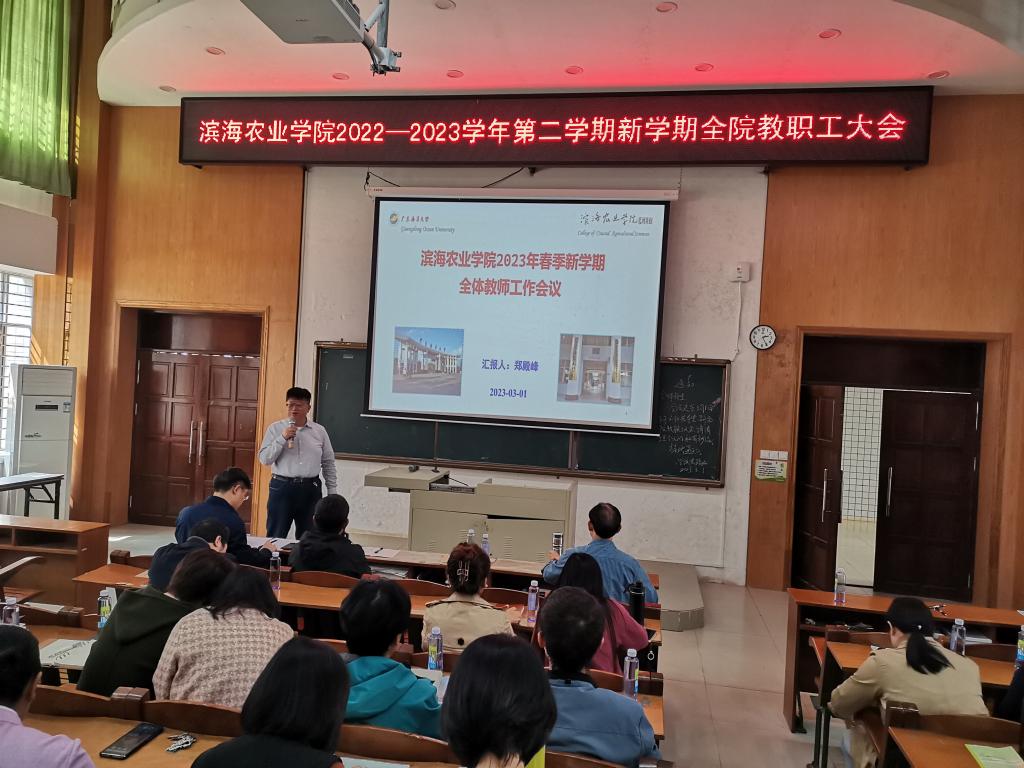 郑殿峰经理传达了学校2023年新学期工作会议精神,解读了学校2023年重点工作。并从9个方面介绍学院2023年重点工作:一是全力做好新农科实习实践创新基地的谋划与建设;二是推进申博、申硕准备工作;三是推进国家耐盐碱水稻技术创新中心华南中心建设;四是加强团队建设;五是加强国家级、省级一流专业建设;六是打造科研团队,推进科研与服务乡村振兴;七是继续优化学院专业设置;八是继续强化对青年教师的的培养;九是加强党的建设,做好安全工作。要求全院教职工落实好学校、学院的重点工作部署,全力推进学院高质量发展,在高水平海洋大学建设的新征程上取得新突破、开创新局面。