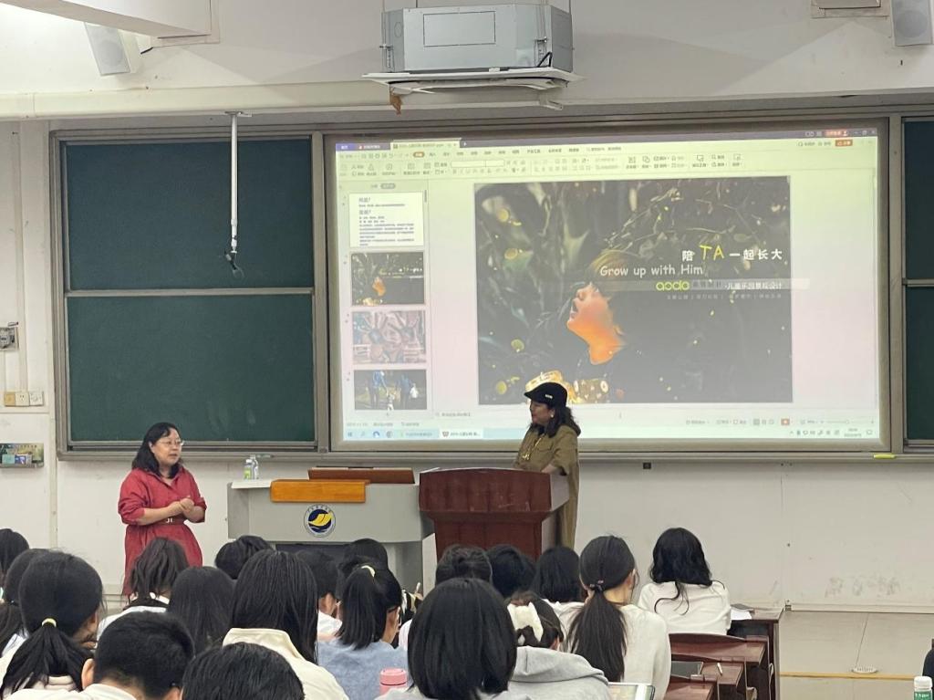 凌敏女士以她多年来获奖的设计项目为例,围绕着儿童友好理念的主题,分享其丰富的设计经验和的价值观,并以腾冲森林秘境公园为例讲述了该公园在地形、原有场地资源保留,生态环境、经济功能以及娱乐功能上的多维度考量设计,提出设计师要基于儿童行为心理学的角度思考,景观设计以安全为重要前提,依据不同年龄阶段的孩子们对场所的需求提供有助于其思维和成长的设计内容。报告结束后,凌敏女士与参会师生进行了深入的交流,一一回答了与会师生在景观规划设计各个阶段的侧重点、景观的可持续性设计、不同语境下的儿童友好公共空间设计等方面的问题。最后,吴刘萍教授对本次学术讲座做简要总结,对凌敏女士提出的“致敬生活,致敬人类,致敬土地”设计观表示赞同。