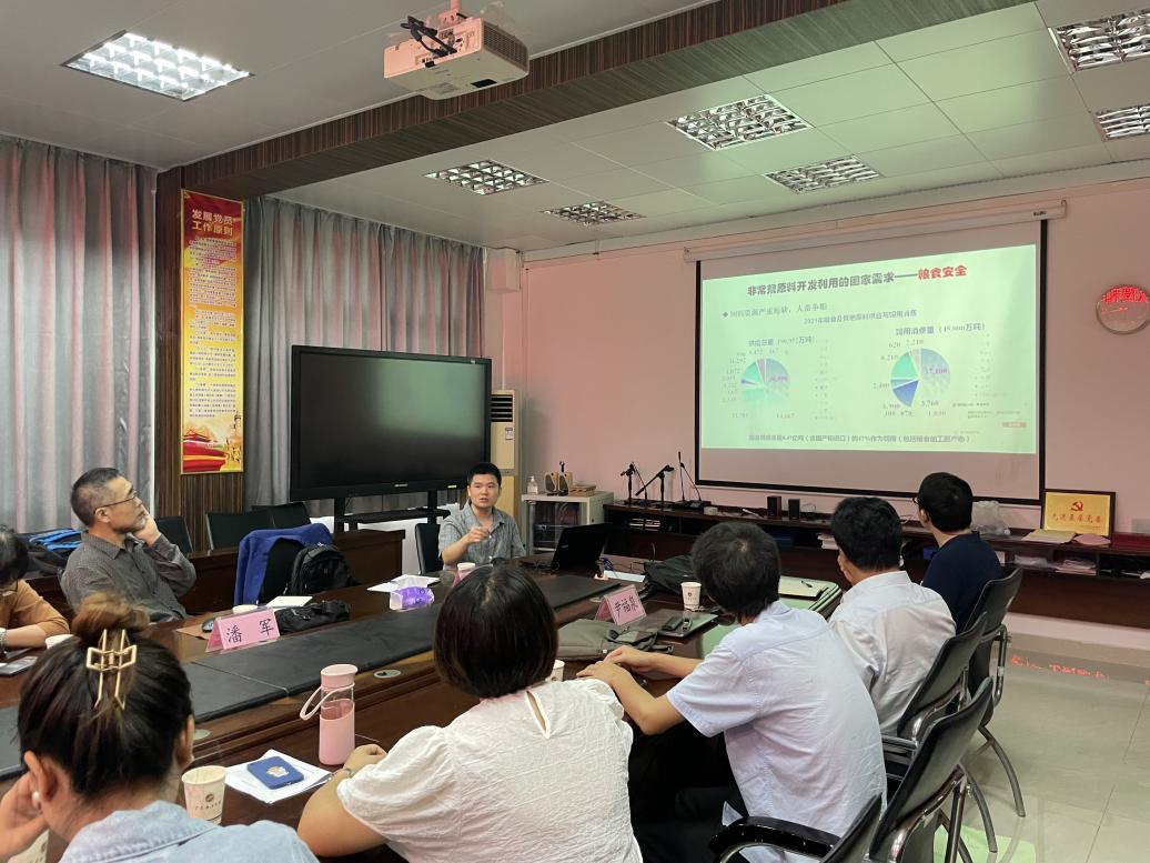 会议首先由李瑞博士进行了题为《非常规饲料资源开发与应用研究进展》的报告,围绕非常规饲料资源开发利用现状、主要非粮型饲料资源的开发利用、基于非常规原料基础的生猪日粮配制及潜在的合作方向等几方面展开详细介绍,并重点对团队已开展的工作及取得的成果进行了分享。接着,尹福泉教授作了题为《粤西地区非常规饲料资源概述》的报告,主要针对粤西地区菠萝渣、木薯、海水稻秸秆等非常规饲料资源的现状、研究成果及未来展望进行介绍。报告结束后双方进行了深入研讨。