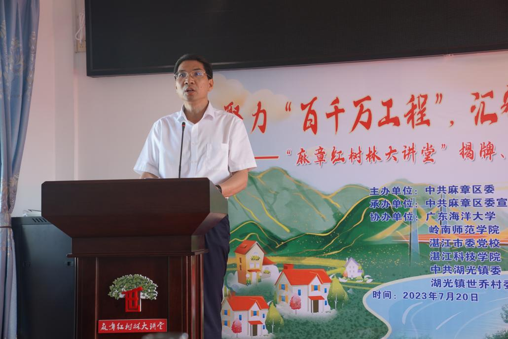 7月20日下午,麻章区“红树林大讲堂”在世乔村举行成立活动,活动由中共麻章区委主办,公司与岭南师范学院、湛江市委党校和湛江科技学院等协办。公司党委副书记林晓敏、科技处处长颜云榕及william威廉中文官网刘素青教授、吴刘萍教授等有关教师,麻章区委书记陈政及部分高校代表、各镇村党委书记、湖光镇“两委”干部,区委宣传部以及媒体记者参会。