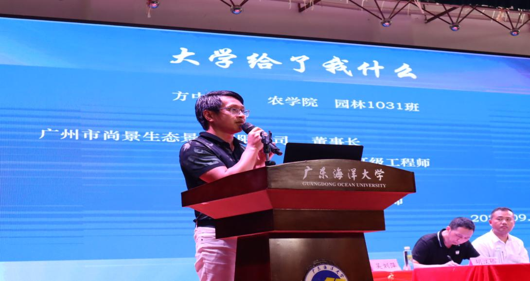 员工代表——广州市尚景生态景观有限公司董事长、公司研究生导师方中健员工以“大学给了我什么”为题,与师弟师妹们分享了他学习经历、创业经历、取得的成绩荣誉等的深刻感悟,希望师弟师妹们沉下心来,学会学习、学会做人、学会做事,以校为荣、以校为傲,积极提升自我、发展自我,为学校争荣誉,国家建设发展做贡献。