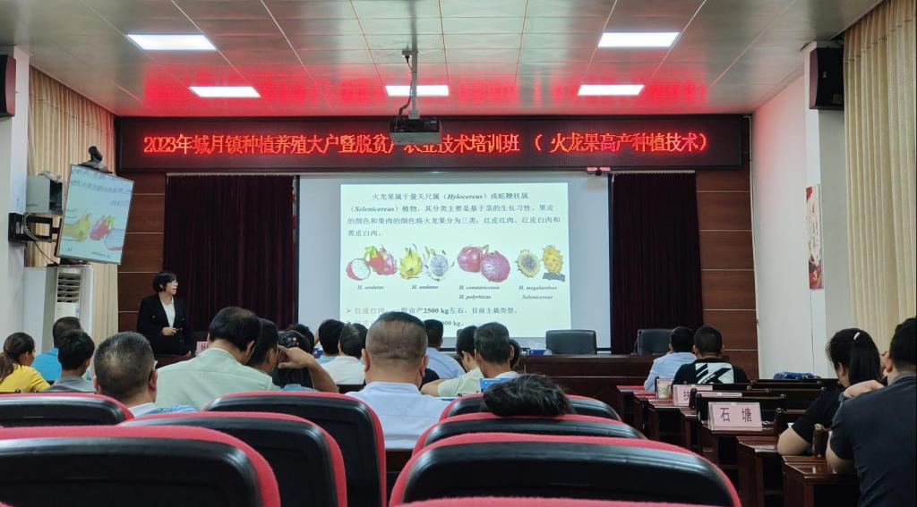 杨转英副教授讲解“火龙果高产栽培技术”。一是介绍火龙果发展前景、种质资源收集、适合本地种植品种,分析不同品种的火龙果特性、质量标准等;二是讲解种植技能知识,如栽培及管理方面的相关技术,不得使用高毒高残留农药及除草剂,以保证火龙果品质及食品安全;三是介绍六种高接换种技术。交流互动环节农户们积极分享种植经验,反响热烈,杨教授也一一回答了参训员提出的问题,培训课程取得了良好的效果。