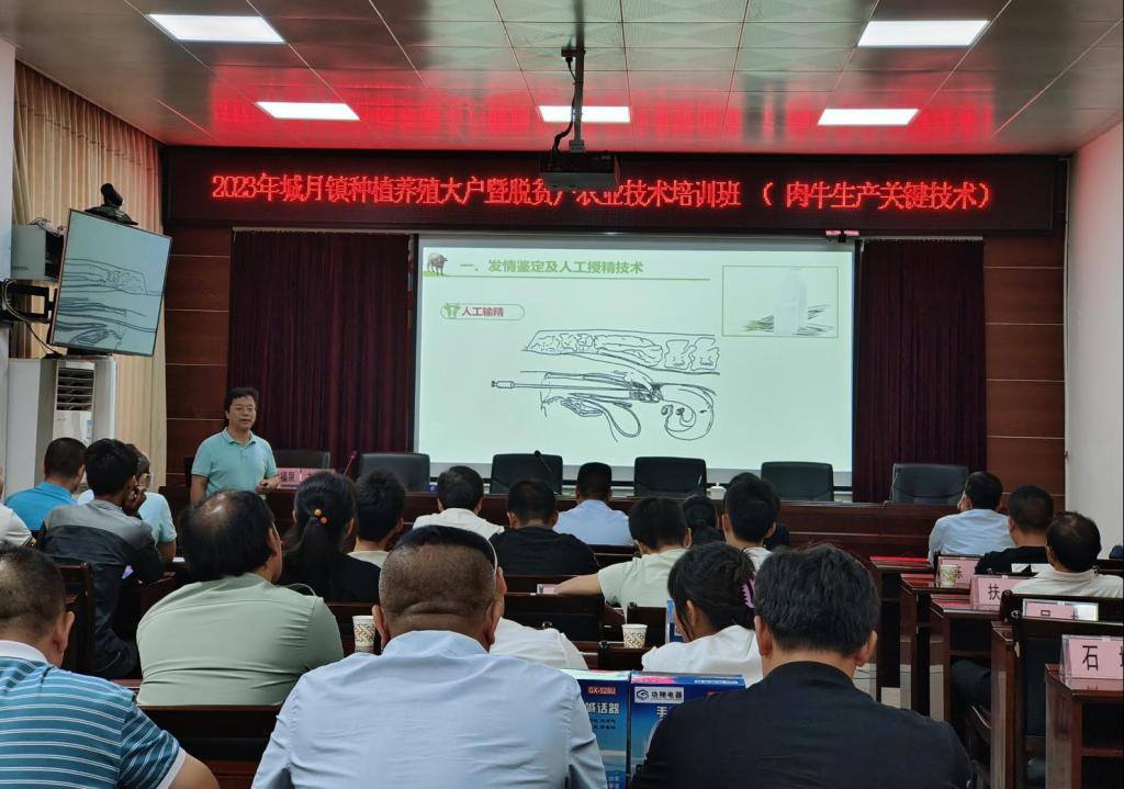 尹福泉教授讲解“肉牛生产关键技术”。一是母牛的发情鉴定及人工授精技术;二是母牛分娩接产及犊牛饲养,介绍饲养技术、饲料配方和喂养方法,提供合理的饲养管理方案;三是肉牛育肥,养殖过程注意事项包括:保证良好的生长环境、搞好驱虫和防疫、及时出售成品牛等;四是介绍常见的牛品种及其特点,讲解如何进行合理的牛的选育工作,提高牛的产量和肉质。用通俗易懂的语言,深入浅出地给养殖户们讲解,精彩的讲解吸引着农户们聚精会神地聆听。