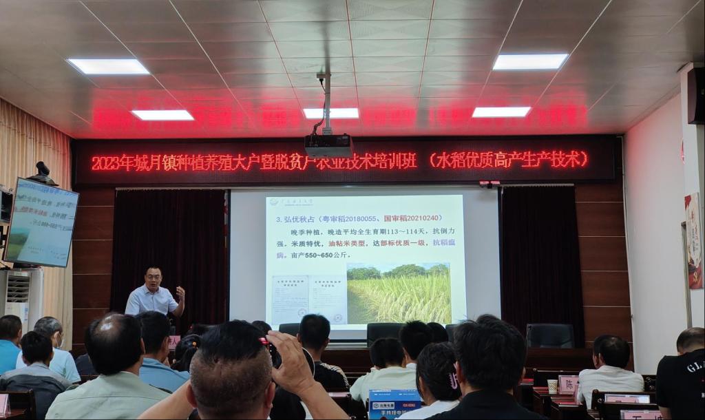 黄永相副教授讲解“水稻绿色高效生产技术”。结合城月镇实际情况,一是要选择主栽抗病优质水稻品种,首选具有抗逆、抗病虫、高产量等特性的种子;二是绿色高产高效栽培,包括播种时间、育秧壮苗、耕培土、除草、施肥、灌溉、排水、病虫害防治等;三是主要病虫害识别及防治以及水稻防灾减灾。本场培训课程中种植户们积极与黄教授沟通互动,提出种植过程当时遇到的实际难题,黄教授也一一进行解答,会后不少农户主动添加专家联系方式,常学习、常提升,让科技成果“长”在土里、“富”在田中。