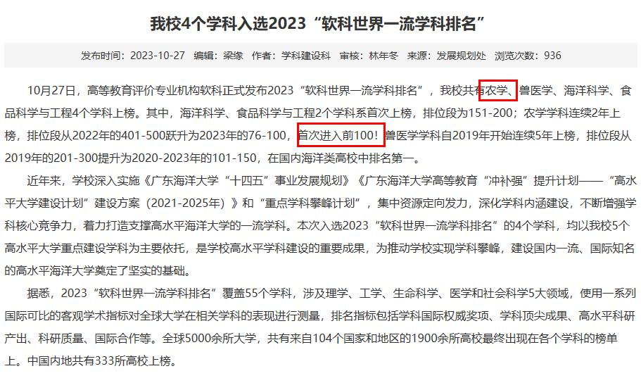 喜报:农学学科进入“软科世界一流学科排名”前100