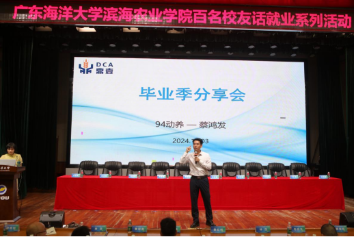 会议上,广东雅琪生物科技股份有限公司董事长陈训银、茂名市鼎壹饲料有限公司董事长蔡鸿发、广垦牧原(湛江)公司副总经理钟日聪等员工倾囊相授,分别讲述他们的求职创业经历,分析了目前行业的现状、前景和用人需求,希望师弟师妹们在校期间要把握住机会,提升自己各方面学习能力,树立正确的三观,转变就业理念,终身学习,努力成为行业、企业和社会领军人才。
