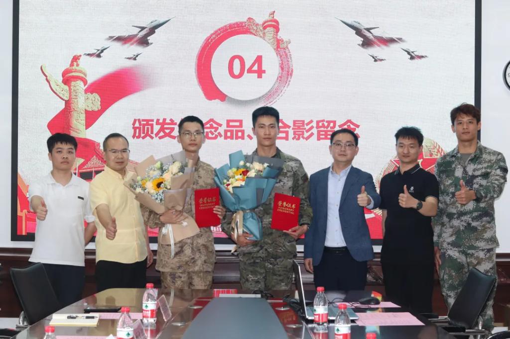 退役班长欧阳泓基带领全场重温了军人誓词,刘文超和梁清志为老兵和新兵员工颁发了荣誉证书和纪念品。