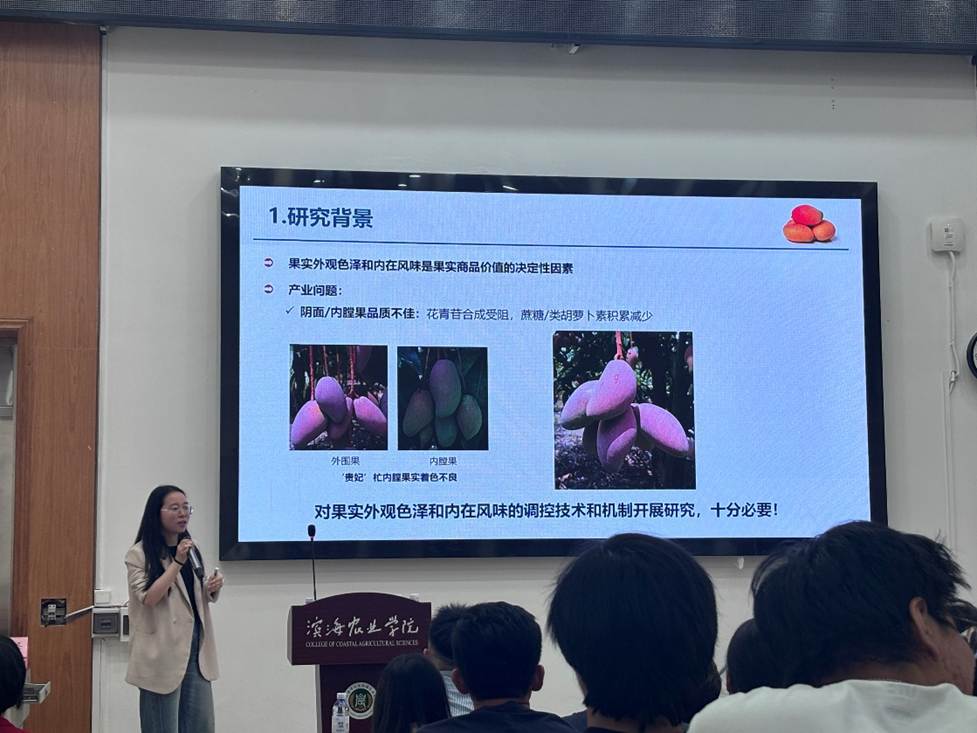 报告会上,钱敏杰以“光调控园艺作物品质的生理及分子机制”为题,详细介绍了不同紫外光对黄瓜的生长、梨和杧果果实的外观着色及品质的影响。倪隽蓓的报告题目是“光和激素调控梨和杧果果实品质形成的分子机制”,重点分享了乙烯和蓝光通过调控ERF与MYB转录因子参与杧果的着色及果实类胡萝卜素的合成。两个报告均围绕园艺植物的外观品质,结合分子生物学手段,通过案例式剖析,阐明其内在的作用机制,内容丰富,深入浅出。在互动环节,现场师生就自己关心的问题与报告人进行了热烈的交流。
