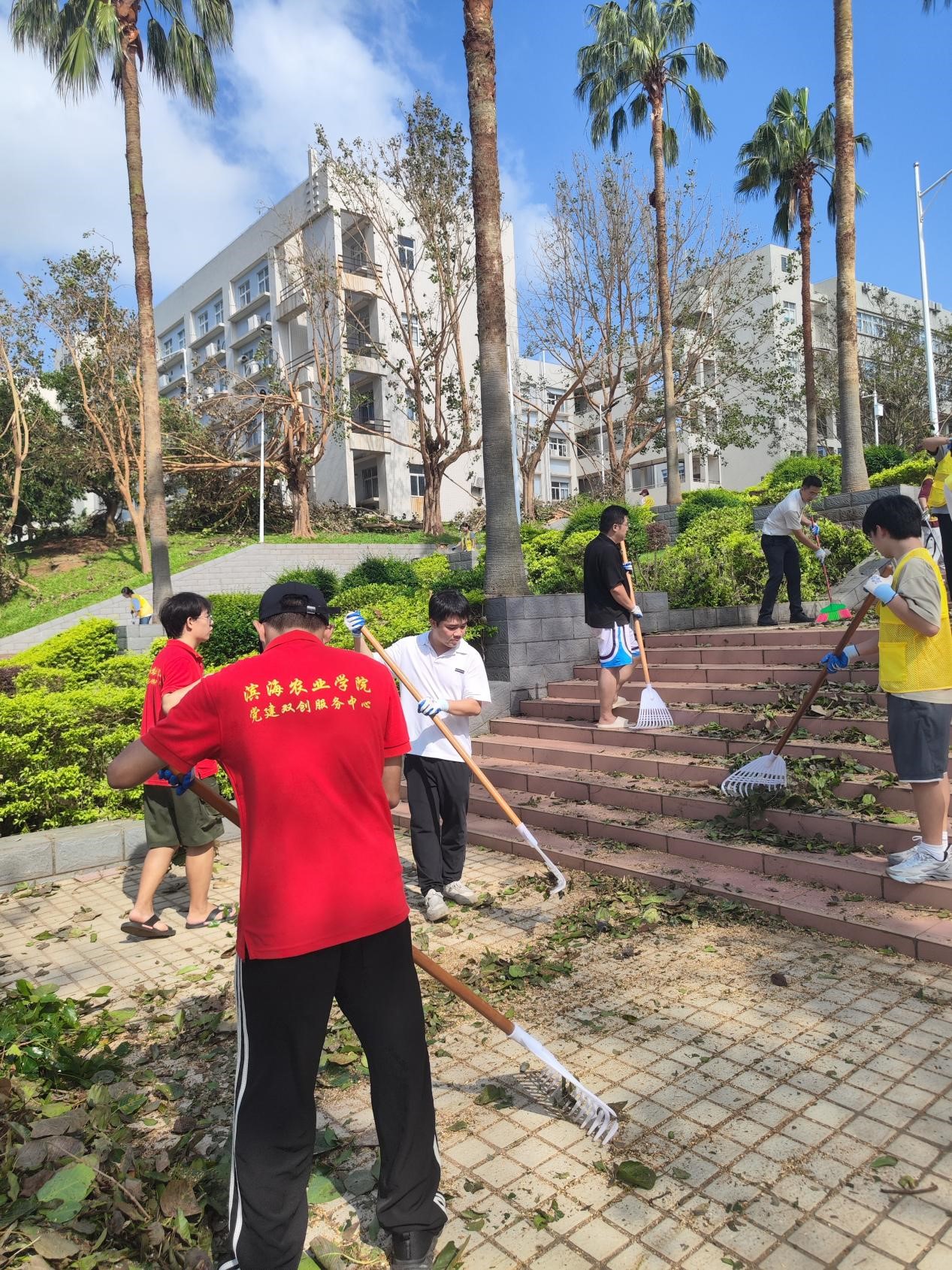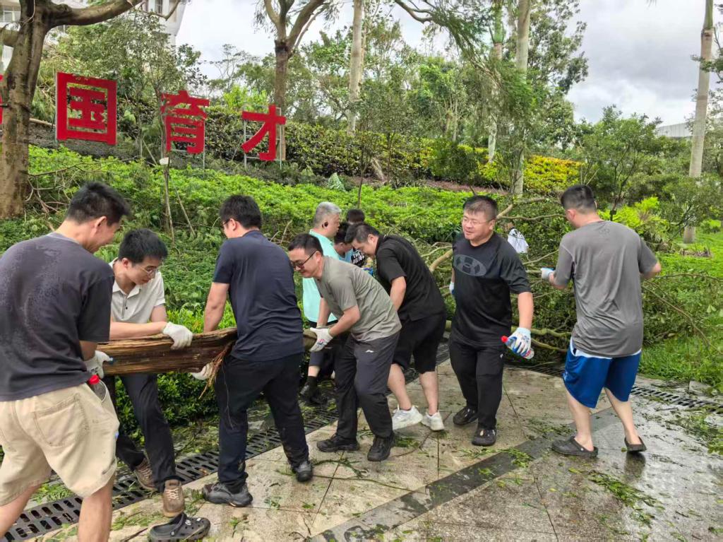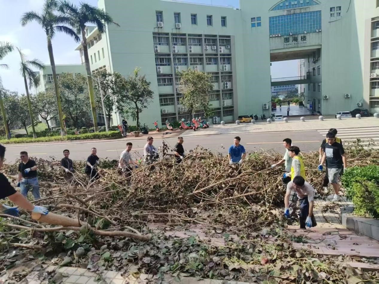 10月5日,第21号台风 “麦德姆” 在湛江市徐闻县东部沿海登陆,湖光校区的校园环境和基础设施遭受严重破坏,校园内树木倒伏、断枝遍地、道路受阻,满目疮痍。6日,公司党委组织党员先锋队第一时间投入到灾后清理重建工作中,重点负责清理兴农楼周围和附近主干道倒伏树木,打通校园师生生活、工作通道。8日,国庆、中秋假期最后一天,为尽快消除近期台风过境对校园环境造成的影响,有效防范公共卫生风险,保障师生身体健康,确保复学复课工作平稳有序。公司党委积极响应关于台风灾后校园重建与卫生防疫工作的指示要求,组织师生开展“救灾复学,净化校园”爱国卫生运动。