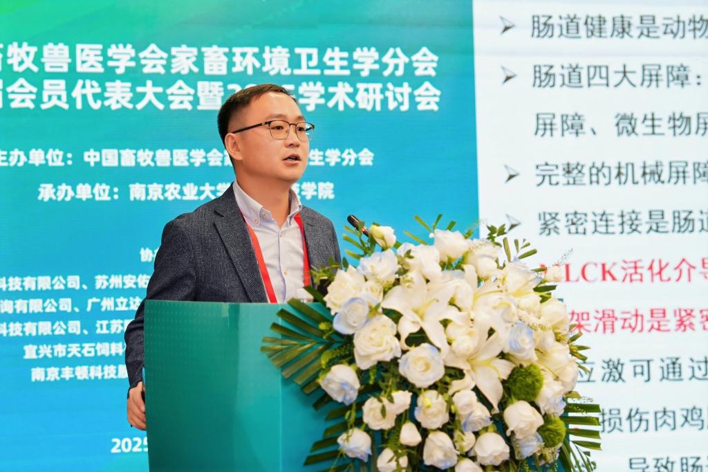 本次大会邀请了中国农业科学院北京畜牧兽医研究所熊本海研究员、南京农业大学朱伟云教授和赵茹茜教授、山东农业大学林海教授等专家做大会主旨报告,中国农业大学吴中红教授、浙江大学汪开英教授等25位专家做大会报告。刘文超受邀作了题为《褐藻寡糖通过AKK菌改善热应激肉鸡肠道机械屏障功能》的大会报告,详细介绍了公司畜牧学科历史沿革、发展现状,以及团队在海洋活性物质饲料化利用及肉鸡环境应激营养调控领域的最新研究进展。