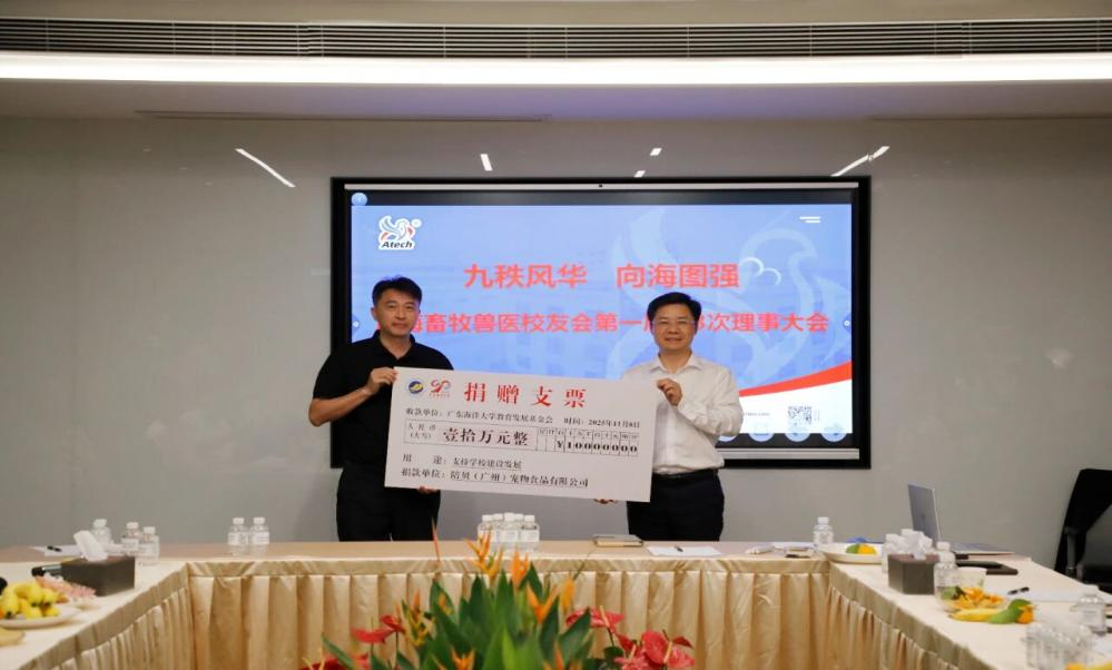 许德贤理事在大会现场向学院捐赠人民币壹拾万元整,许德贤表示:“海大的培养让我们有能力在行业立足,如今回馈母校,是希望能助力更多学弟学妹深耕动物健康食品赛道,为产业输送更多专业人才。”马驿代表学院接受捐赠,并对畜牧兽医员工会长期以来对学院建设的关注与支持致以诚挚谢意。他表示,畜牧兽医员工会架起了员工与母校、企业与行业的桥梁,依托这一宝贵平台,员工们相识相知、结为挚友。员工们同心协力,让社会看到了海大畜牧兽医人的担当,用实实在在的行动为行业发展注入了力量,更让海大的名片愈发鲜亮。时值海大90周年校庆,学院领导走访各地员工,只为诚挚邀请大家重返母校,重温那段青春岁月中真挚的情谊。更希望员工们将这种互帮互助、服务行业、回馈社会的精神,代代相传给师弟师妹们,让海大畜牧兽医人的初心与担当,在薪火相传中愈发坚定。