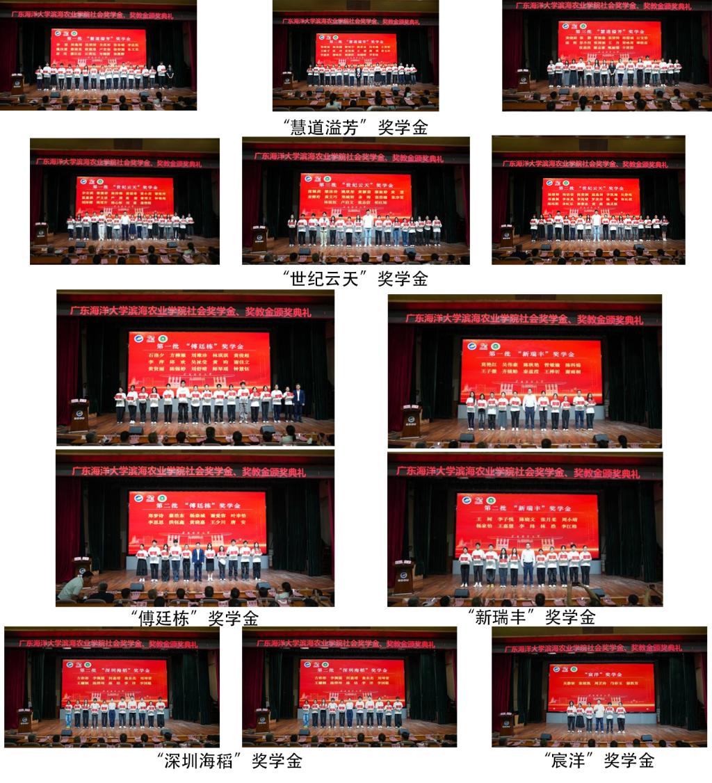 广东慧道溢芳环境科技有限公司董事长何敏桢女士、世纪云天(海南)投资集团有限公司董事长郑殿德先生、世纪云天(海南)投资集团有限公司总经理郑宏霖先生、江西新瑞丰生化股份有限公司董事长周金龙先生、深圳海稻投资有限公司总经理胡新新女士、广东宸洋水产有限公司总经理助理潘培伦先生等捐赠企业代表亲临颁奖典礼现场,并为获奖同学们颁发获奖证书。